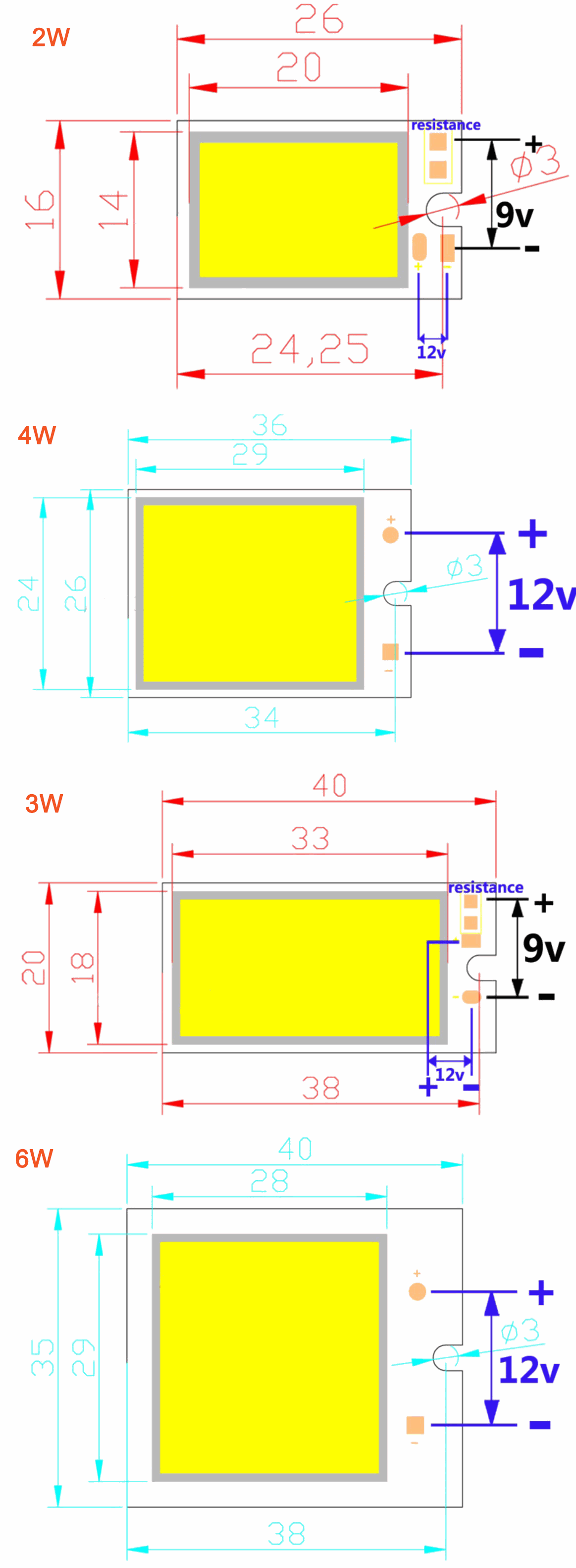 • Power : 2W(26*16mm)  3W(40*20mm)  4W(36*26mm)  6W(40*35mm)